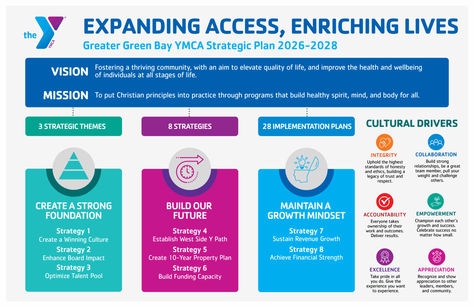 The Greater Green Bay YMCA’s strategic plan charts a bold path forward, focusing on strengthening our organization and the communities we serve. This plan outlines our core priorities and actionable steps designed to drive meaningful impact, foster inclusive growth, and ensure long-term sustainability.